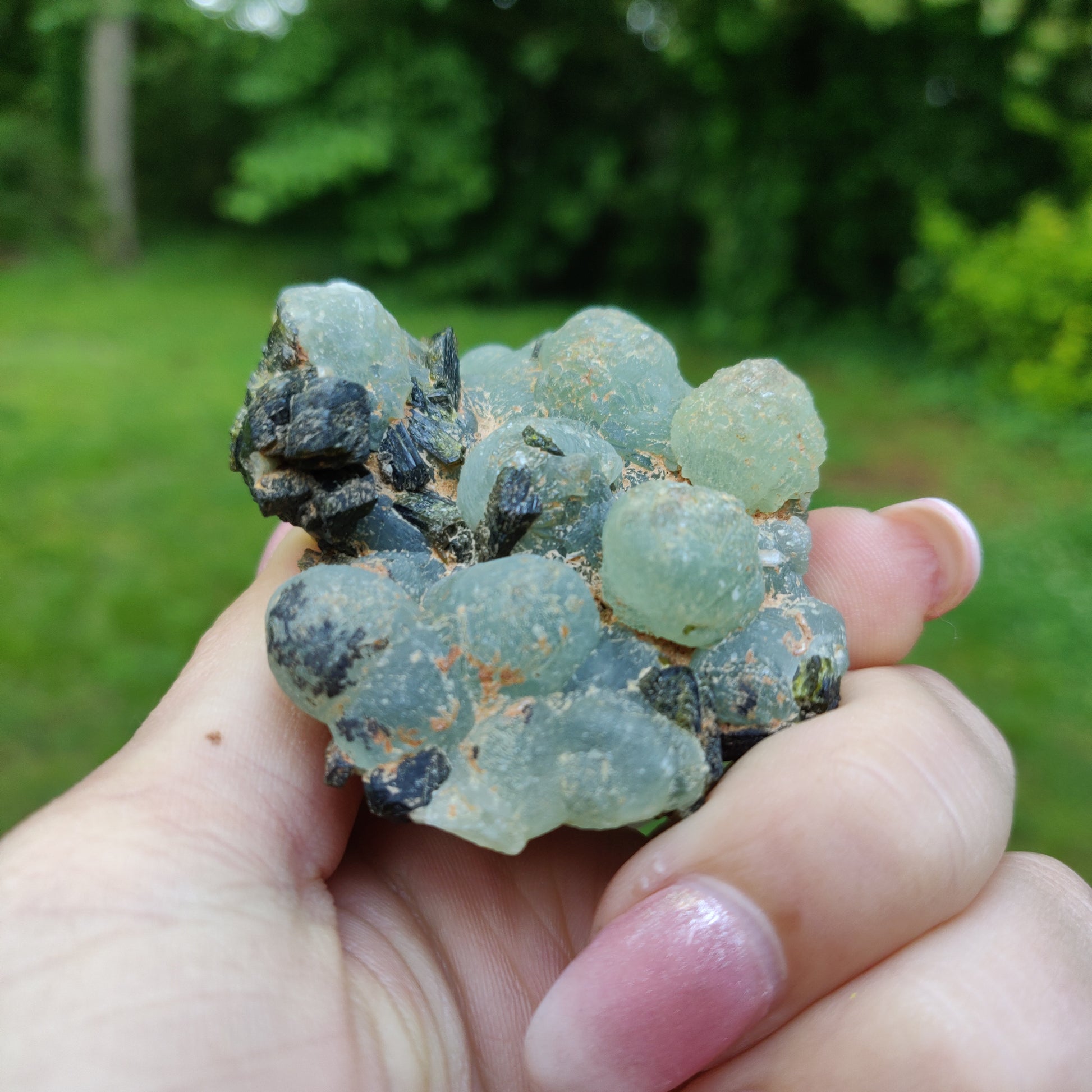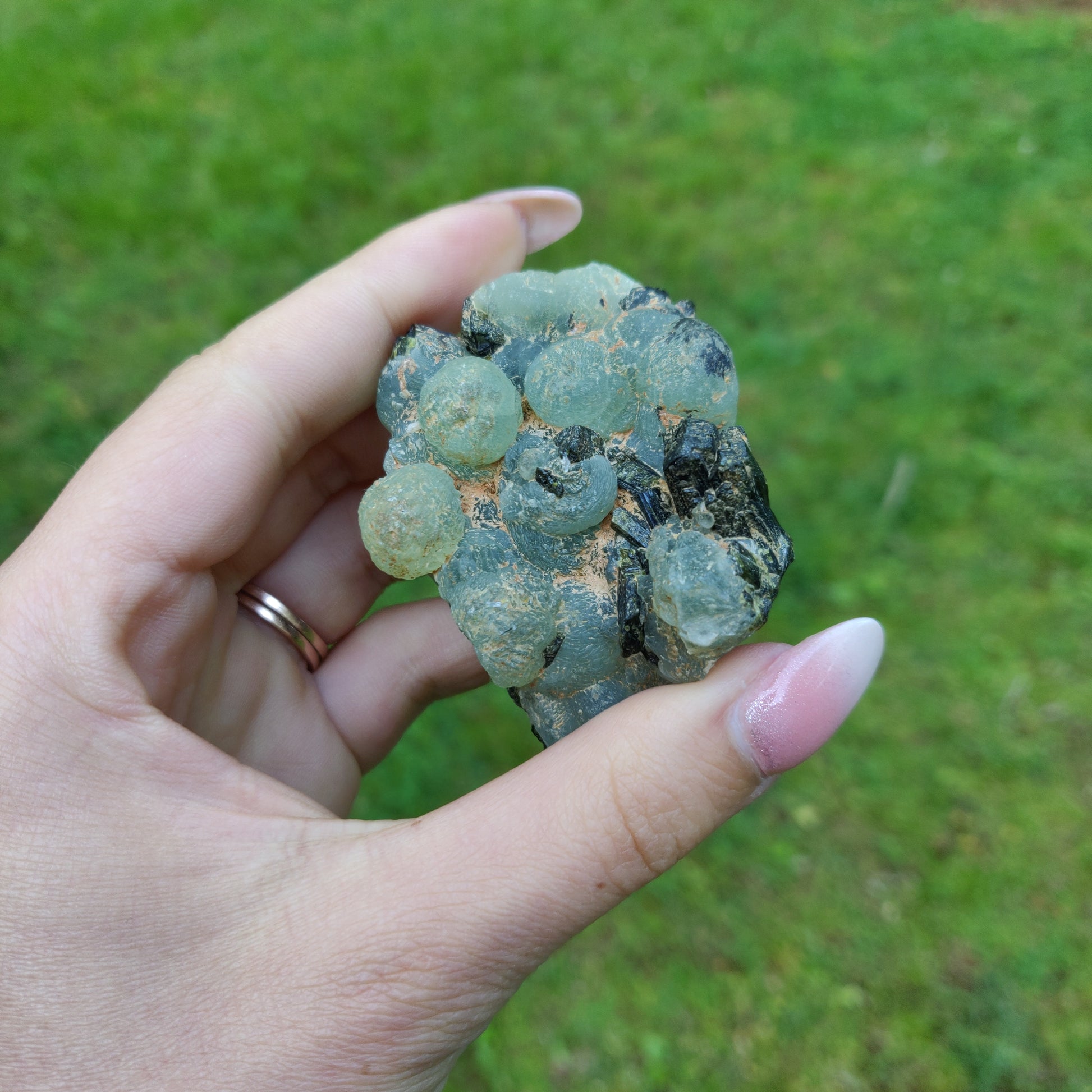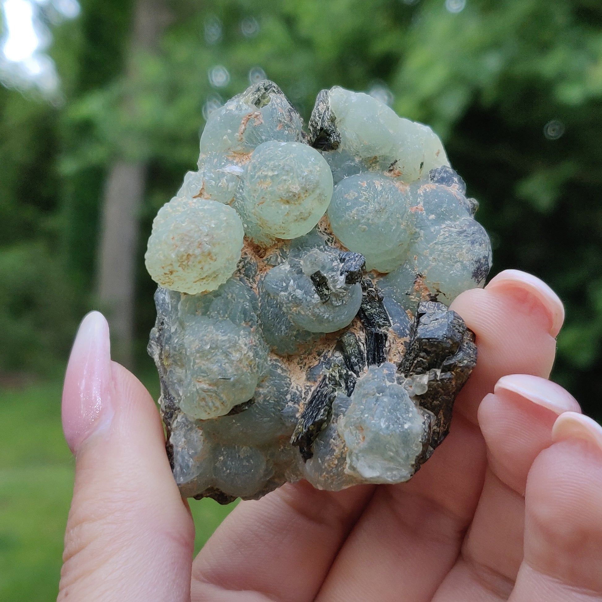 This mini Prehnite specimen is from Mali. It is rough and unpolished in its botryoidal form. Prehnite is described in the Crystal Bible as, "a stone of unconditional love and a crystal to heal the healer." is a wonderful stone for your home. Its healing energies can turn your home a sanctuary and a place of rejuvenation, as it is a helpful aid in organization, decluttering, and allowing yourself to let go of possessions that you no longer need. Prehnite is also a calming stone.