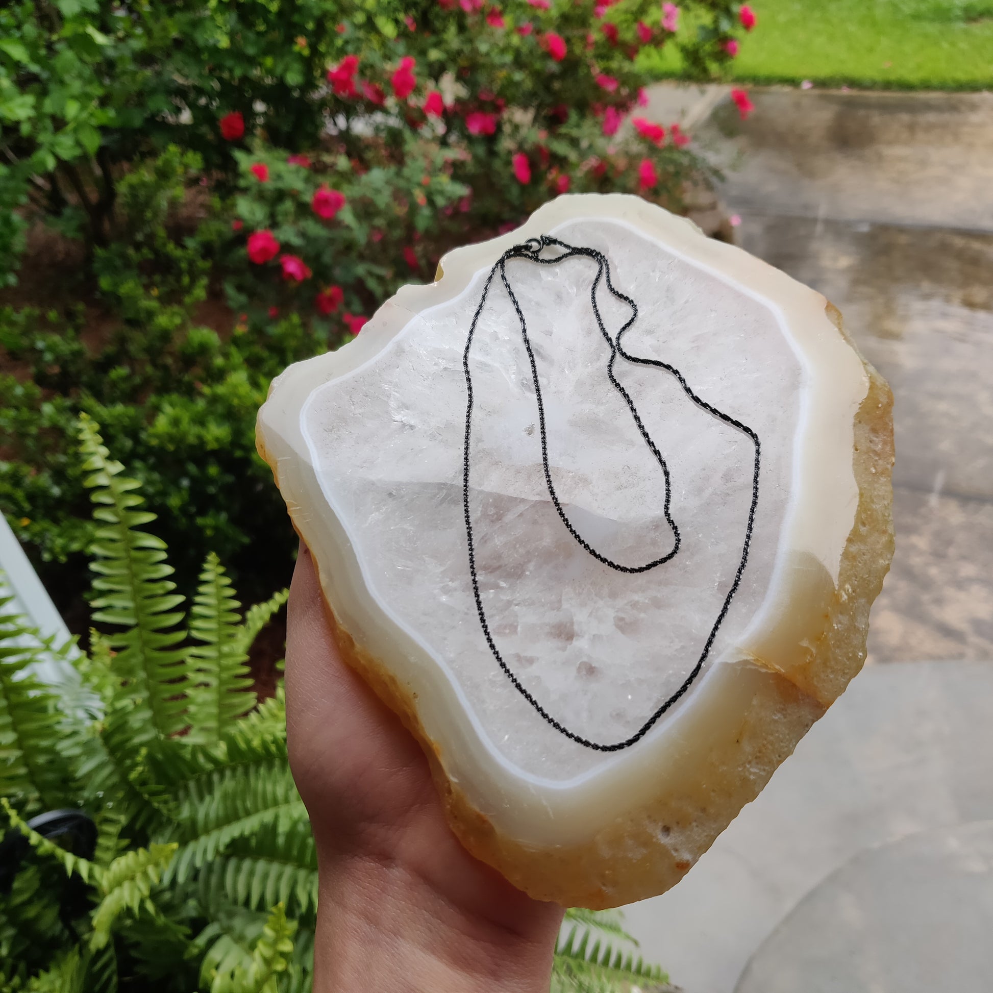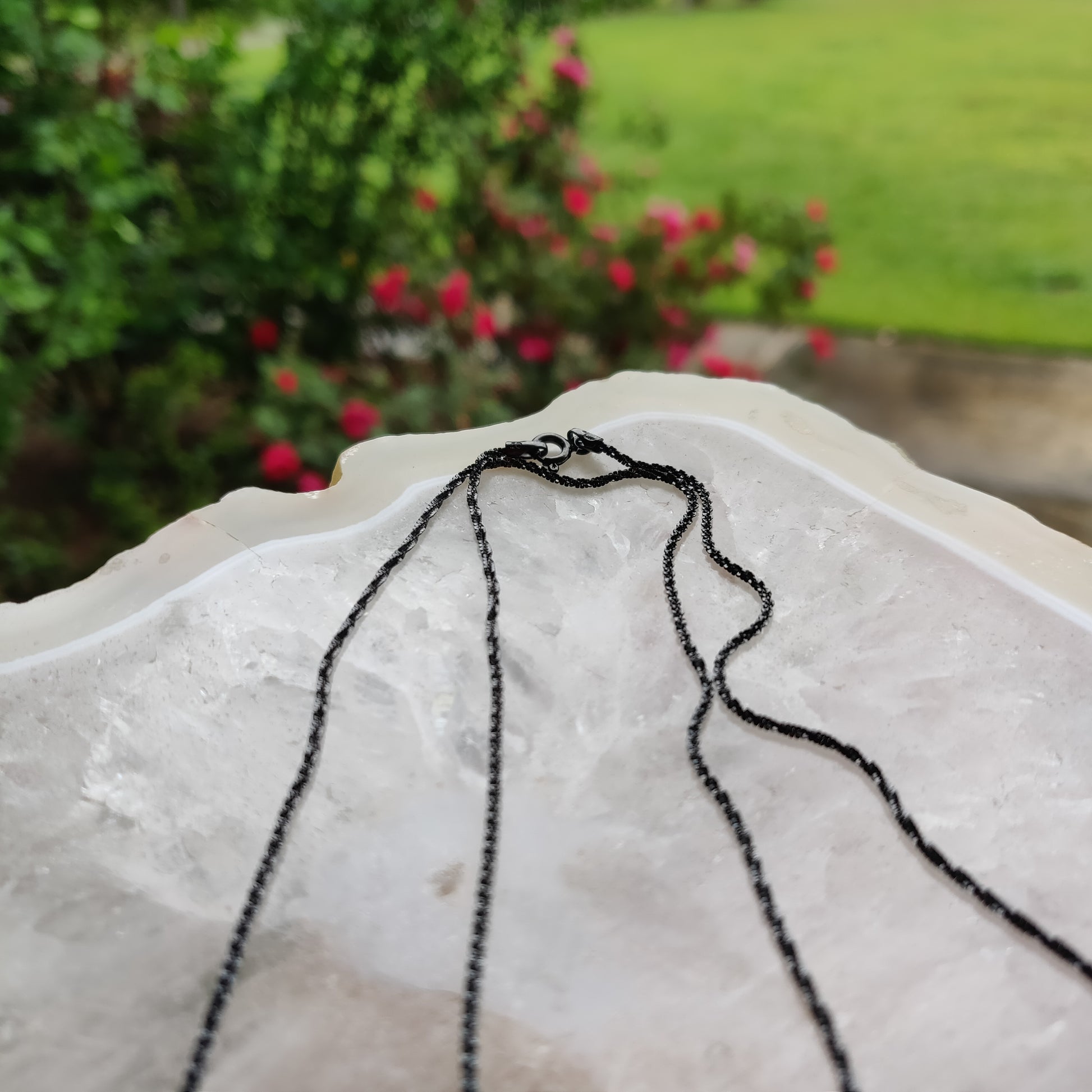 This gorgeous black chain is Italian sterling silver plated with a black metal called ruthenium. Ruthenium is a hard, metallic, chemical element that is commonly found as a rare earth metal. Ruthenium’s atomic number is 44 and its atomic weight is 101.07. It is a member of the platinum family. At only about 0.0004 parts per million, ruthenium is one of the rarest elements in the earth’s crust.