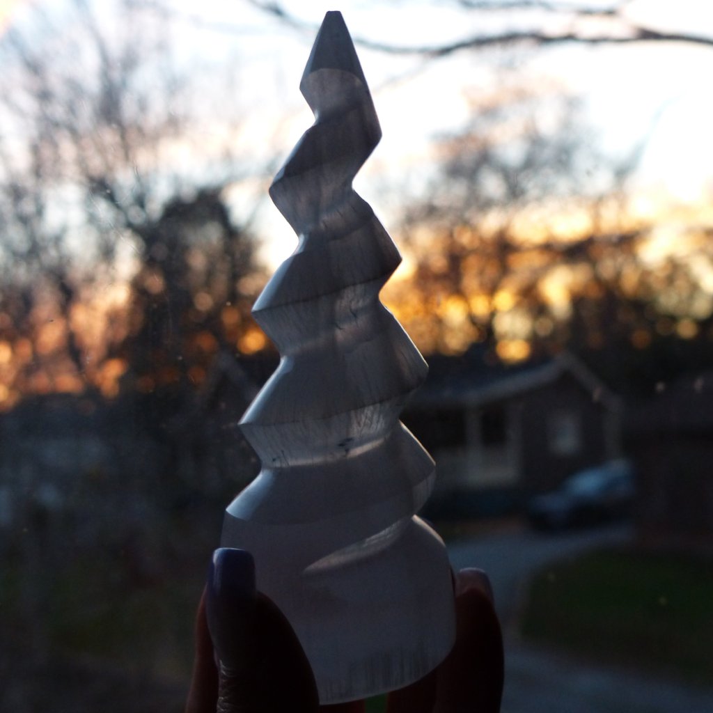 *Please note: this is a natural gem that will have imperfections. There are a few small chips and nicks. Natural beauty <3 Selenite is a soft mineral, so it should be kept dry.