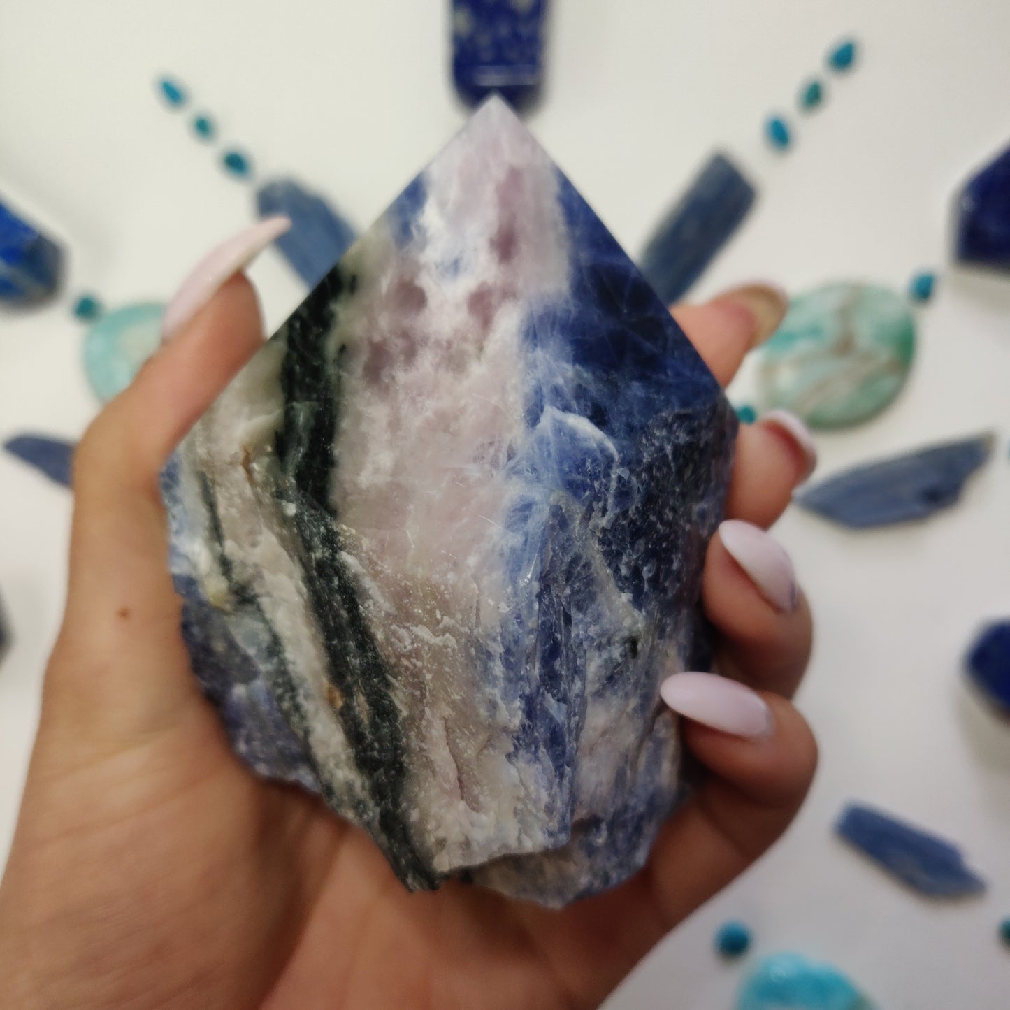 This beautiful Sodalite point is polished into a point at the top and left raw and unpolished on its bottom half.