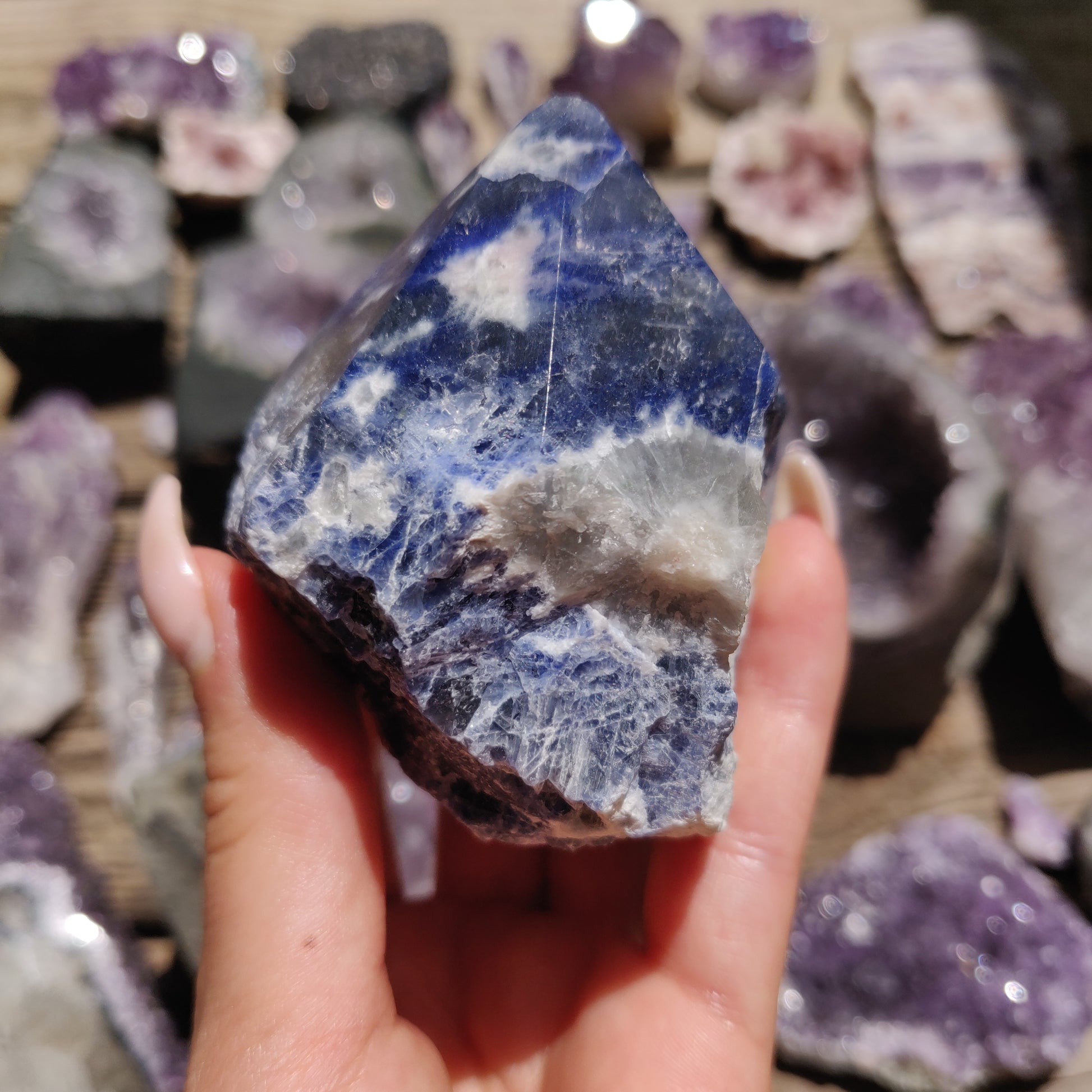 This beautiful Sodalite point is polished into a point at the top and left raw and unpolished on its bottom half.