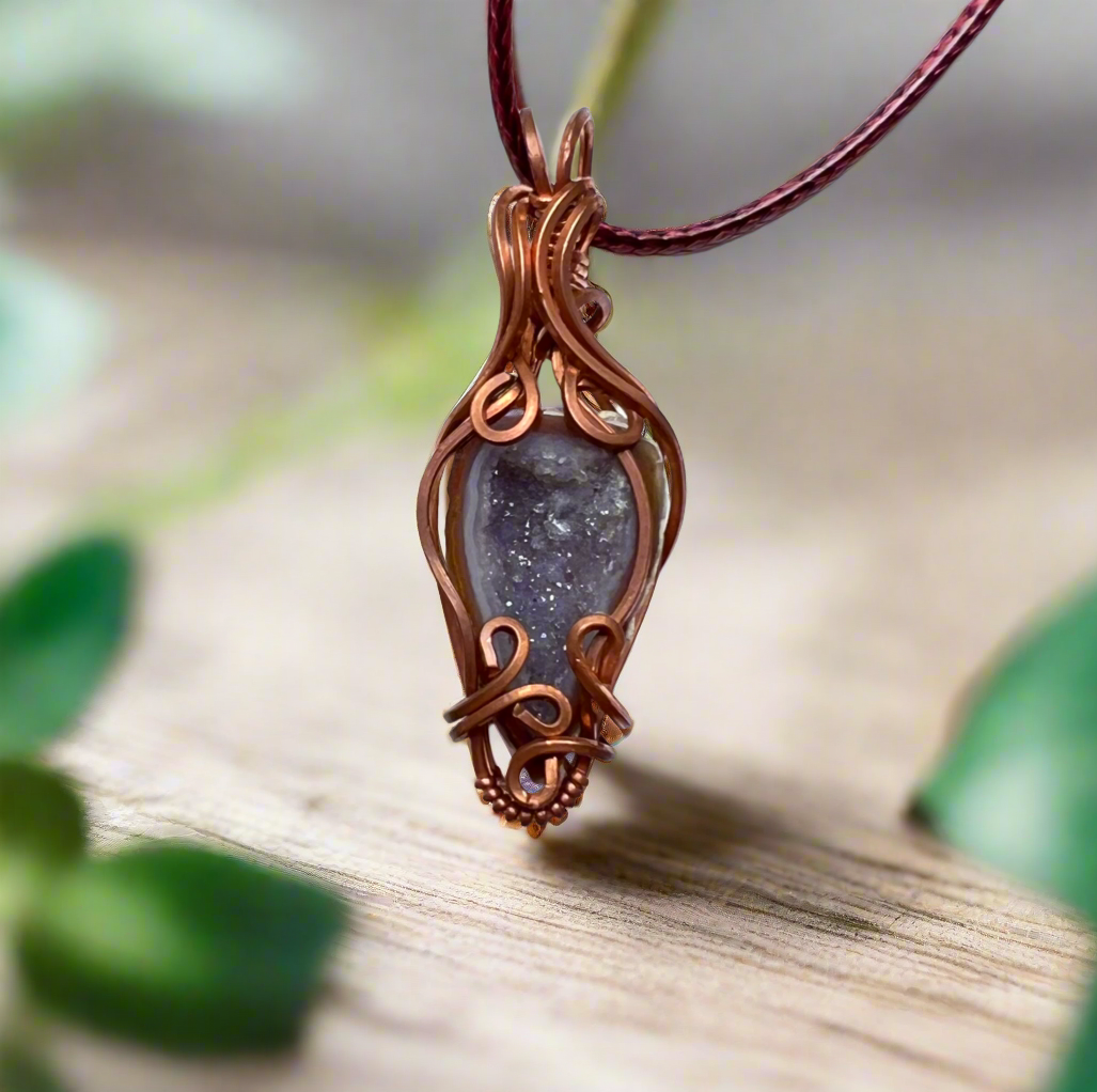 I wire-wrapped this stunning Tabasco Geode in copper. Experience the magic of the world's tiniest geode formations, adorned with mesmerizing druzy quartz crystals that shimmer and sparkle. Embrace the versatility of this piece, as it effortlessly complements any outfit with its earthy tones.I hope that you enjoy this piece as much as I did creating it! This OOAK piece comes on an adjustable 18”-20” red cotton cord chain. If you would prefer a different color cotton cord, just let me know in the notes to seller. Please reference the last photograph on this listing for color options.