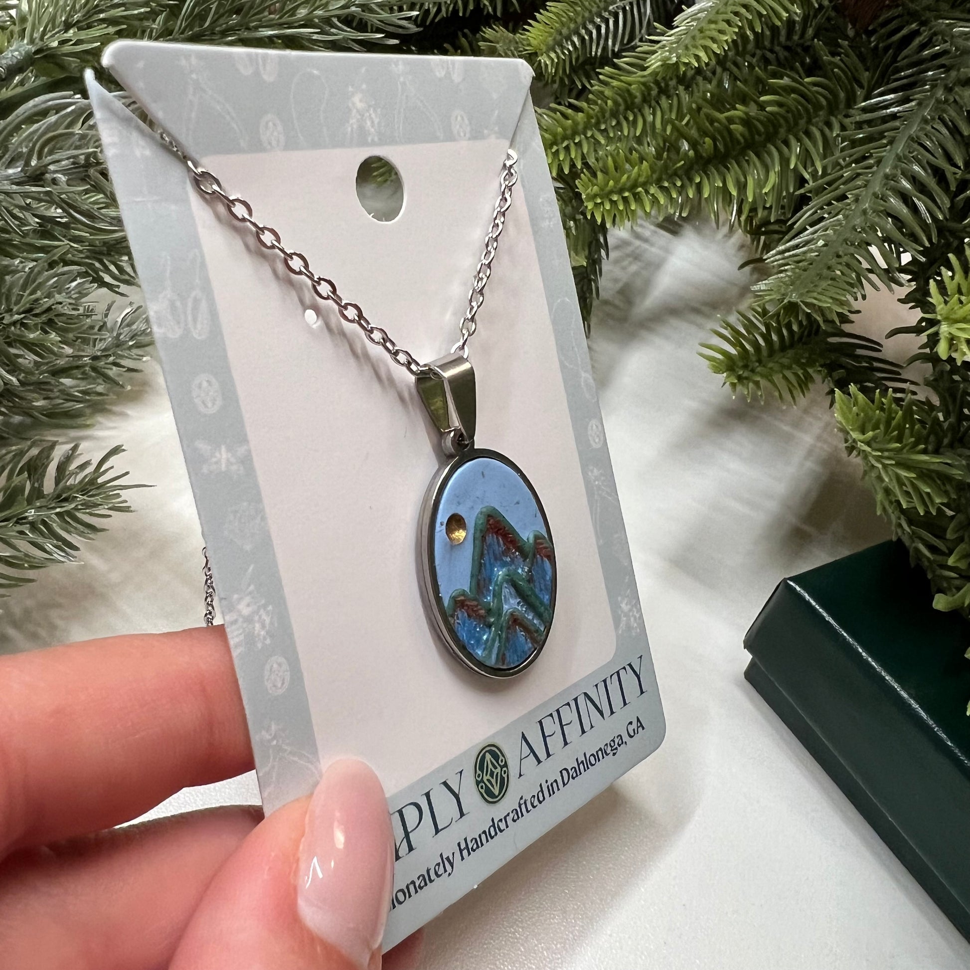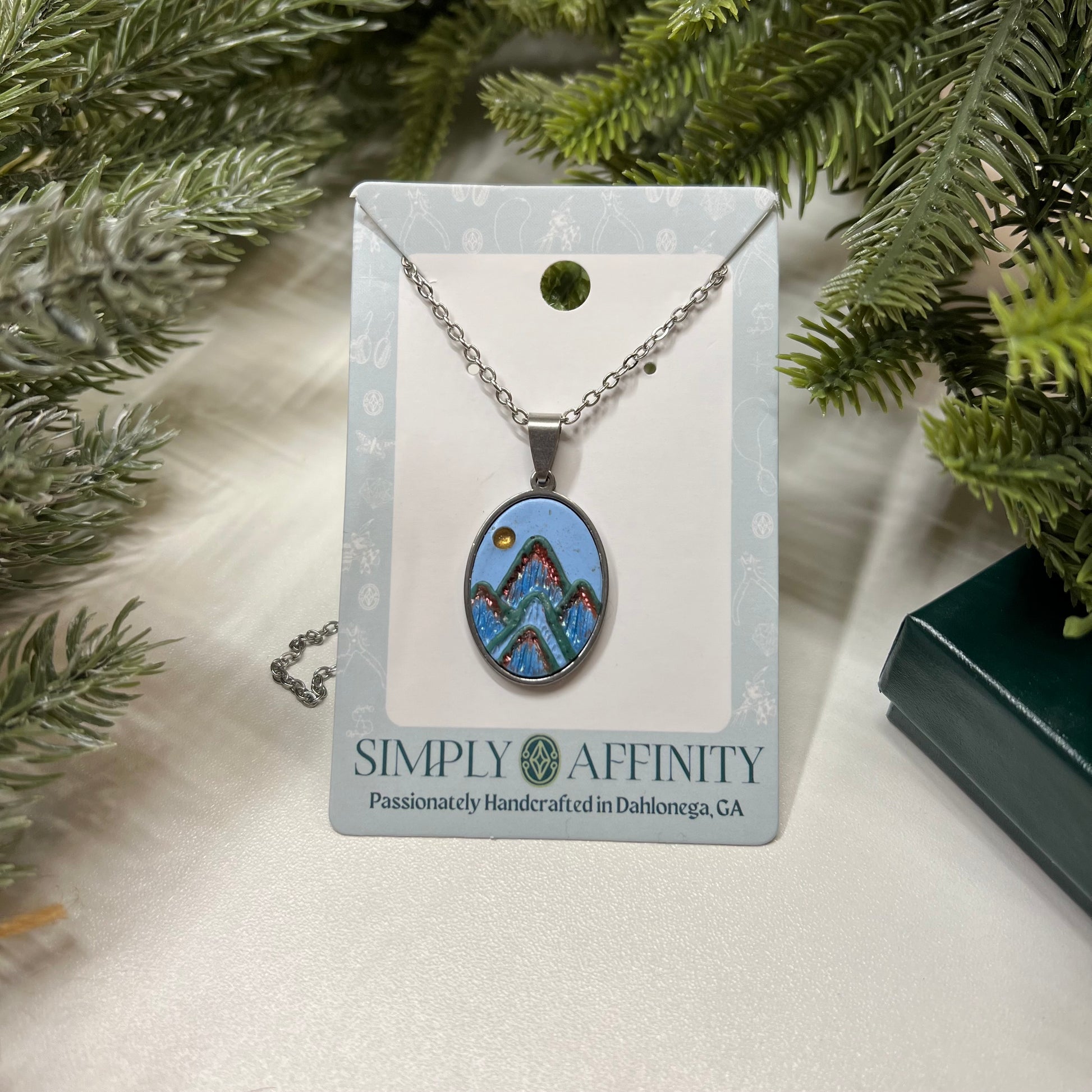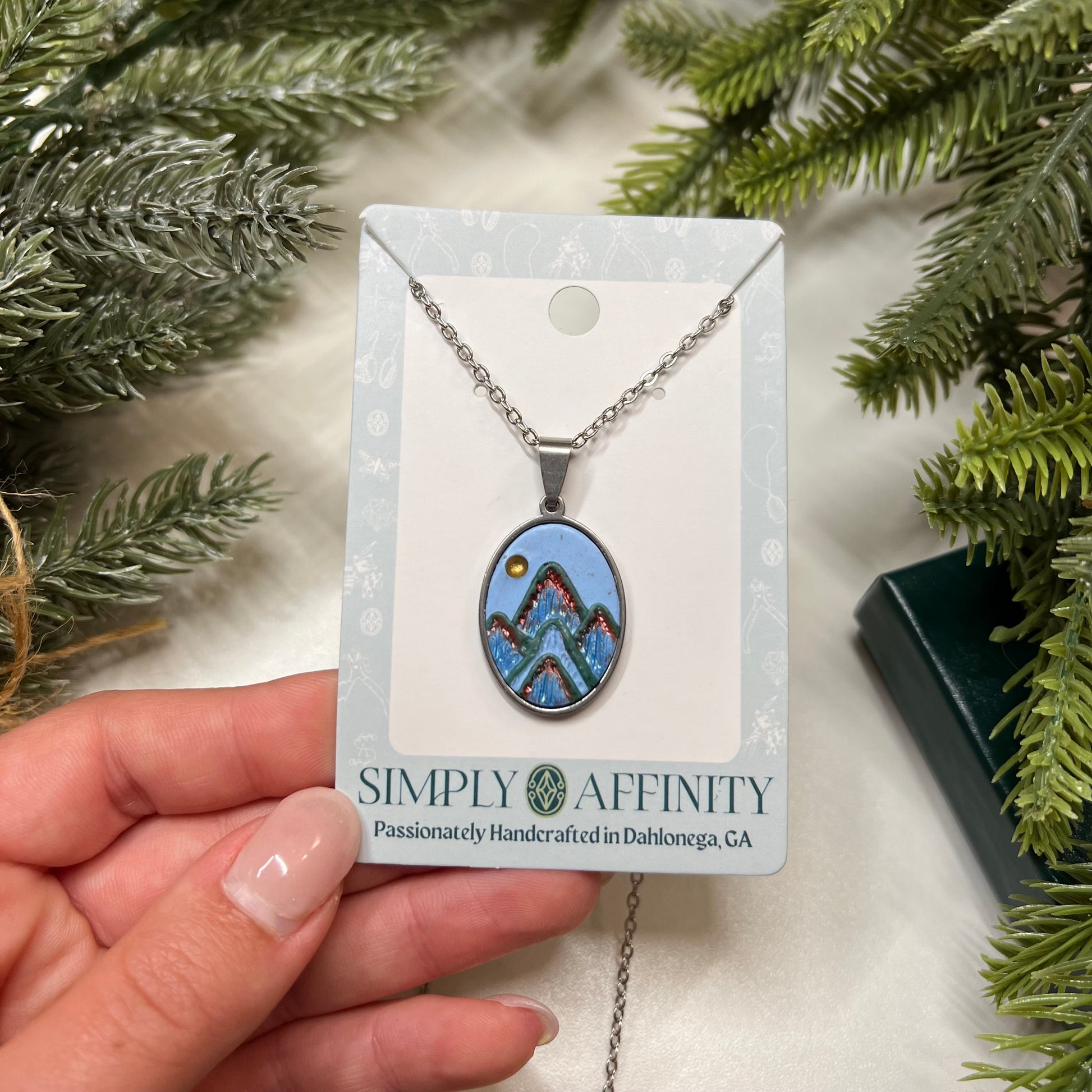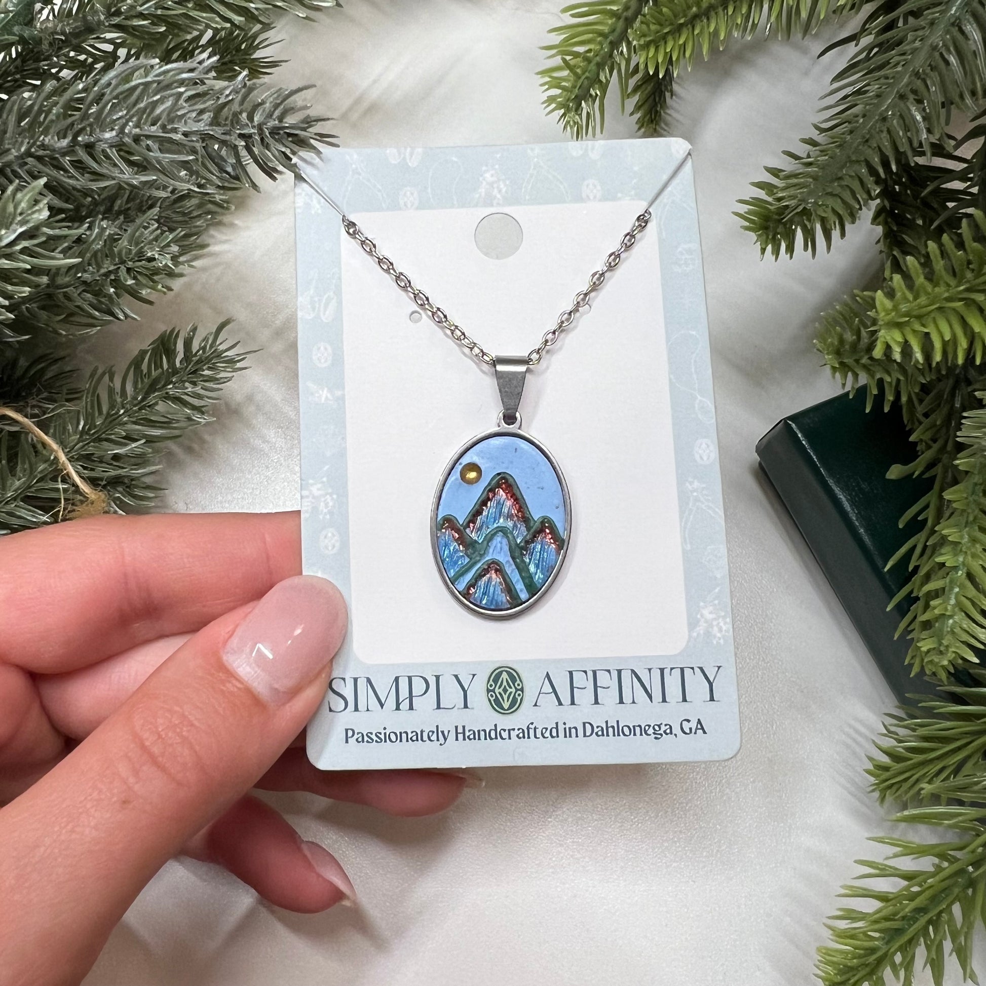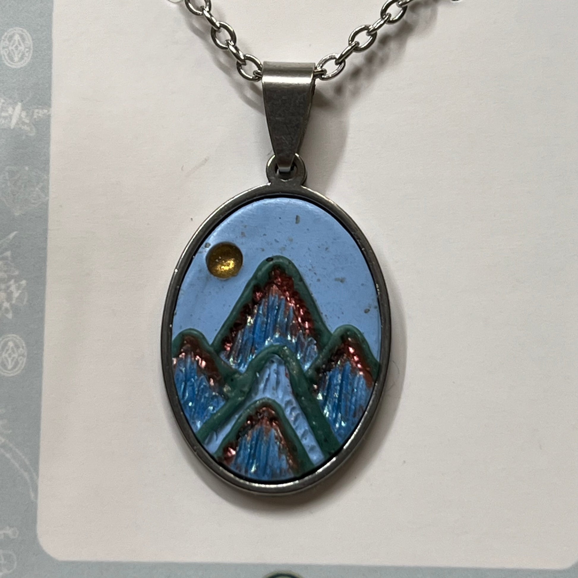 Carry the beauty of the mountains with you wherever you go with this hand-sculpted geometric mountain scene necklace. Made from lightweight polymer clay, this necklace features a stunning, minimalistic interpretation of a mountain landscape. The design is accented with intricate textures, which I’ve carefully highlighted with shimmering mica powders to add a soft, ethereal glow that brings the rugged beauty of the mountains to life. After sculpting and baking this piece, I set it into a stainless steel bezel.