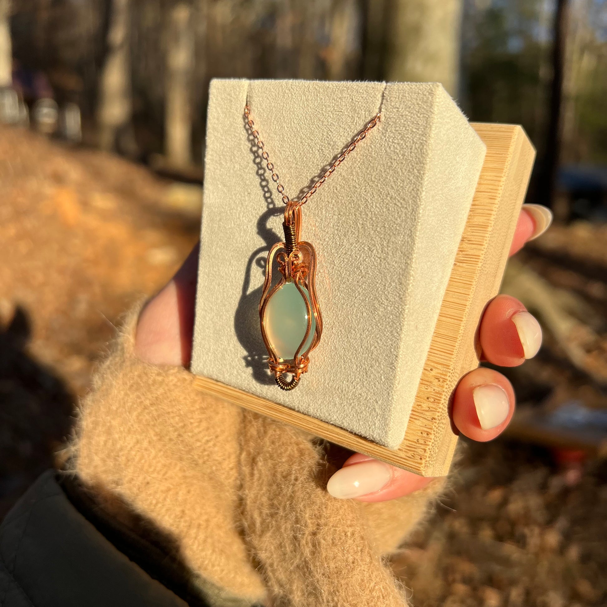 I’m excited to share this hand-wrapped necklace. The star of this piece is a stunning chalcedony gemstone, that seems to glow from within.