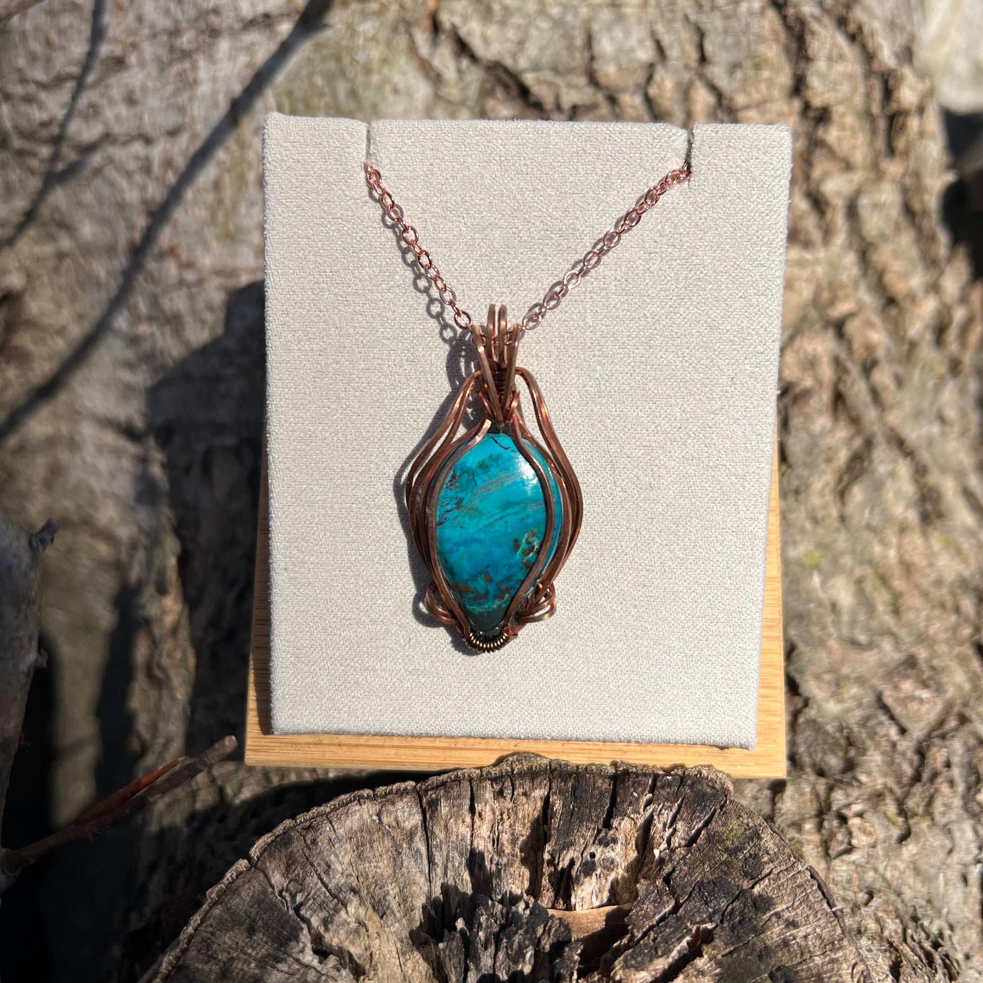 I’m excited to share this hand-wrapped necklace. The star of this piece is a stunning Chrysocolla gemstone.