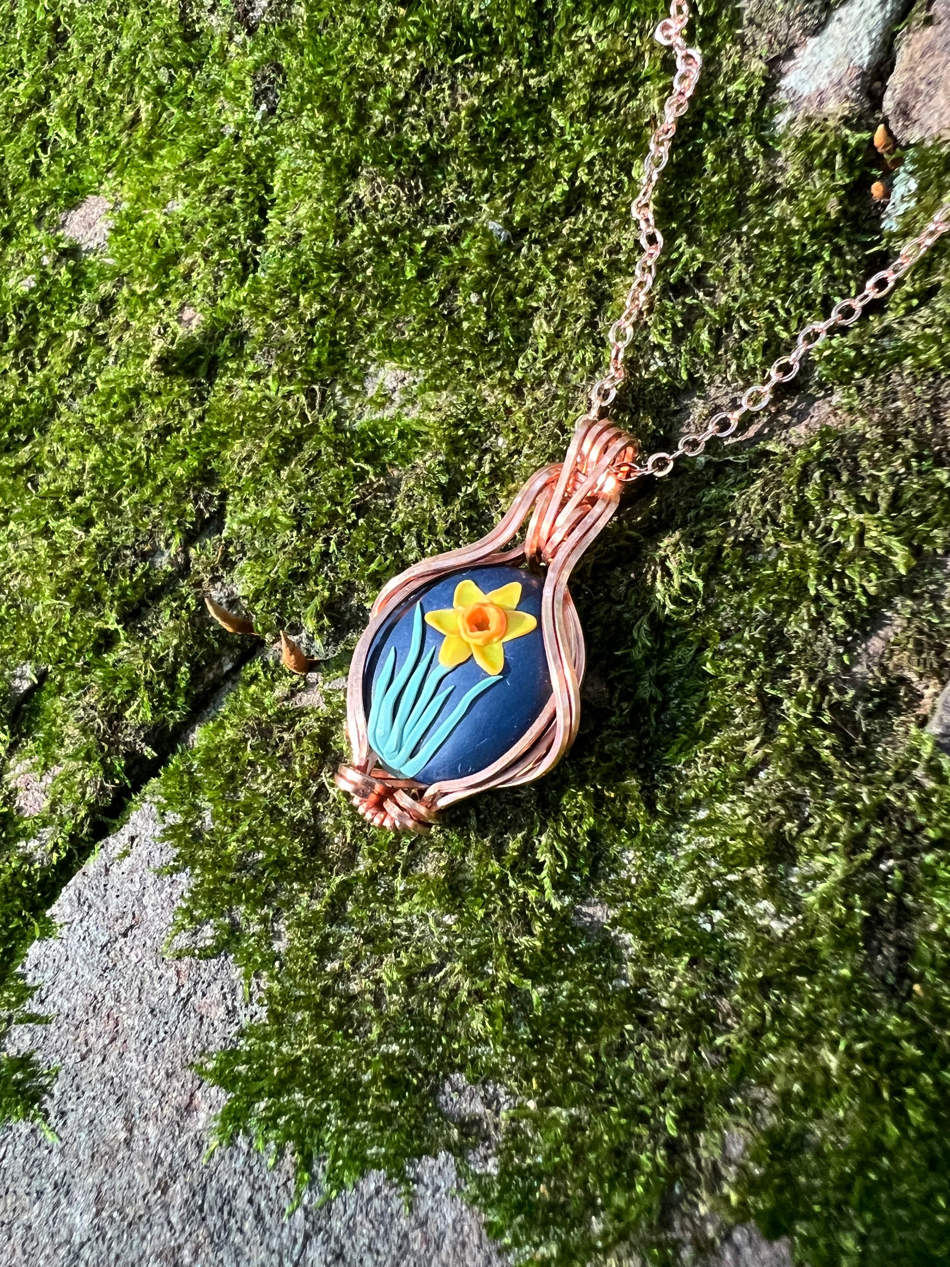 Celebrate the arrival of spring year-round with this daffodil necklace. Every petal, trumpet, and detail is carefully hand-sculpted from custom mixed polymer clay colors—never painted. Each flower is shaped entirely by hand, making every piece truly unique and full of character. Once I sculpted and baked this piece, I wrapped this piece in copper wire to make it into a unique pendant. I loved combining my polymer clay and wire work into one special piece!